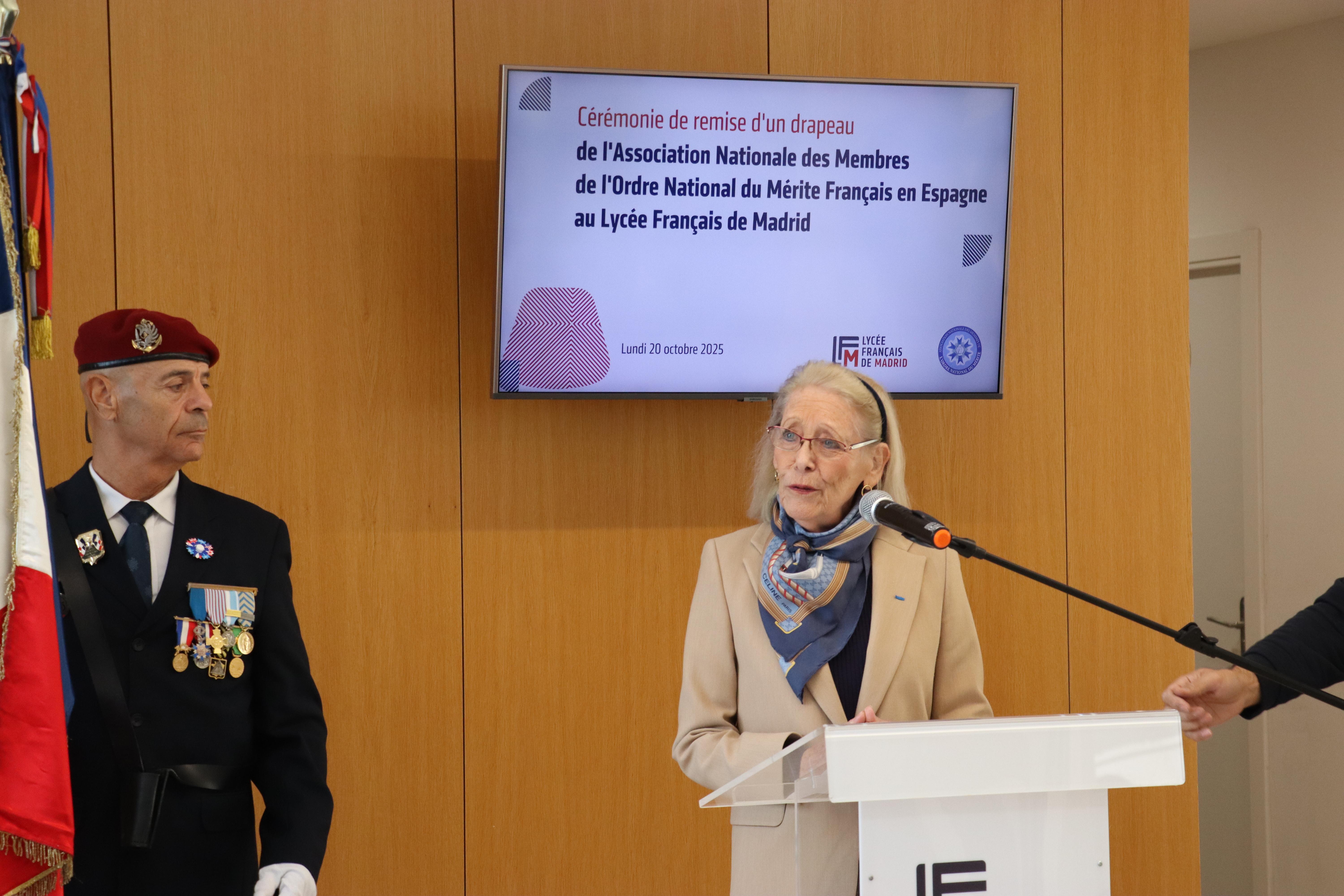 La présidente de l’ANMONMFE, après avoir précisé aux élèves d’une classe de seconde accompagnée de leur professeur en Sciences économiques et Sociales, qui nous étions et tout l’attachement que nous portons à la jeunesse et à la transmission de nos valeurs, a remis au Proviseur du Lycée le drapeau qui nous a accompagnés pendant 30 ans et que nous avons dû changer pour respecter les nouvelles normes et le nouveau logo.